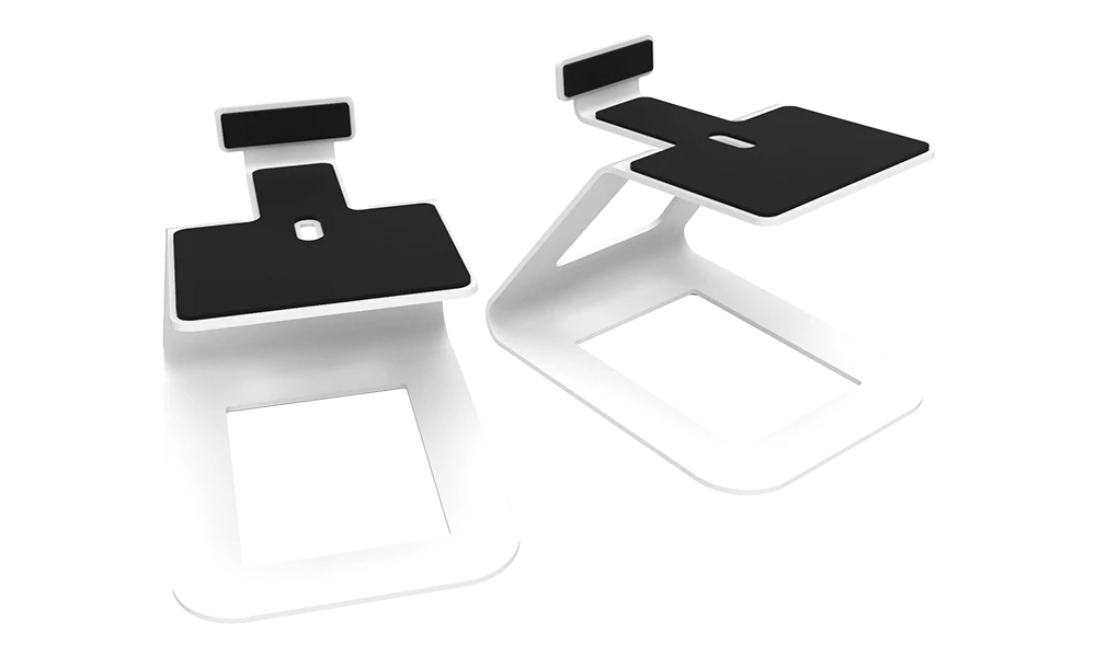 Take your sound game to the next level with the SE6 Elevated Speaker Stand. Standing at a height of 6.9β³, the SE6 boosts your speakers up and off the surface of your desk so that theyβre better aligned with your ears to give you a flawless on-axis response. Its cantilevered and angled platform is designed to absorb resonance and deliver a pure sound without any reflections from nearby surfaces. 2.5mm of silicone padding provide a strong grip that helps keep your speakers and stand in-place. For maximum protection, the SE6 comes with a set of mounting screws that you can use to secure compatible speakers to the stand to prevent falls and accidents. The SE6 is available in both black and white and can hold up to 22 lbs.